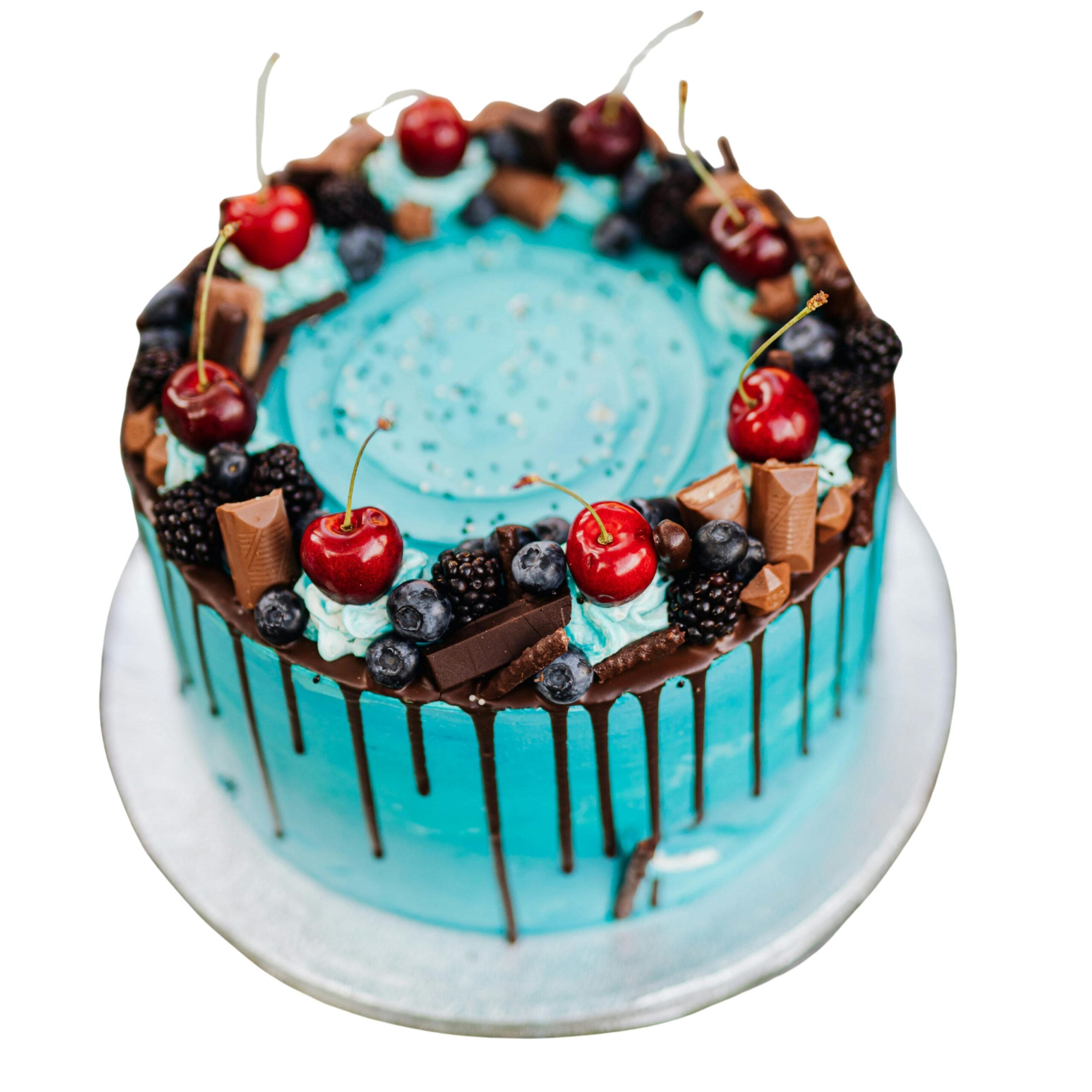 Blue Berry Drip Celebration Cake is a bold and eye-catching designer cake made with bright blue frosting and a dark chocolate ganache drip.