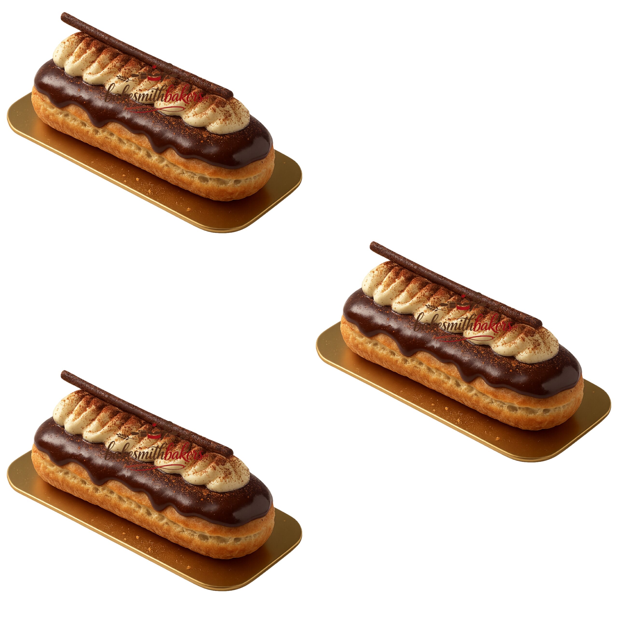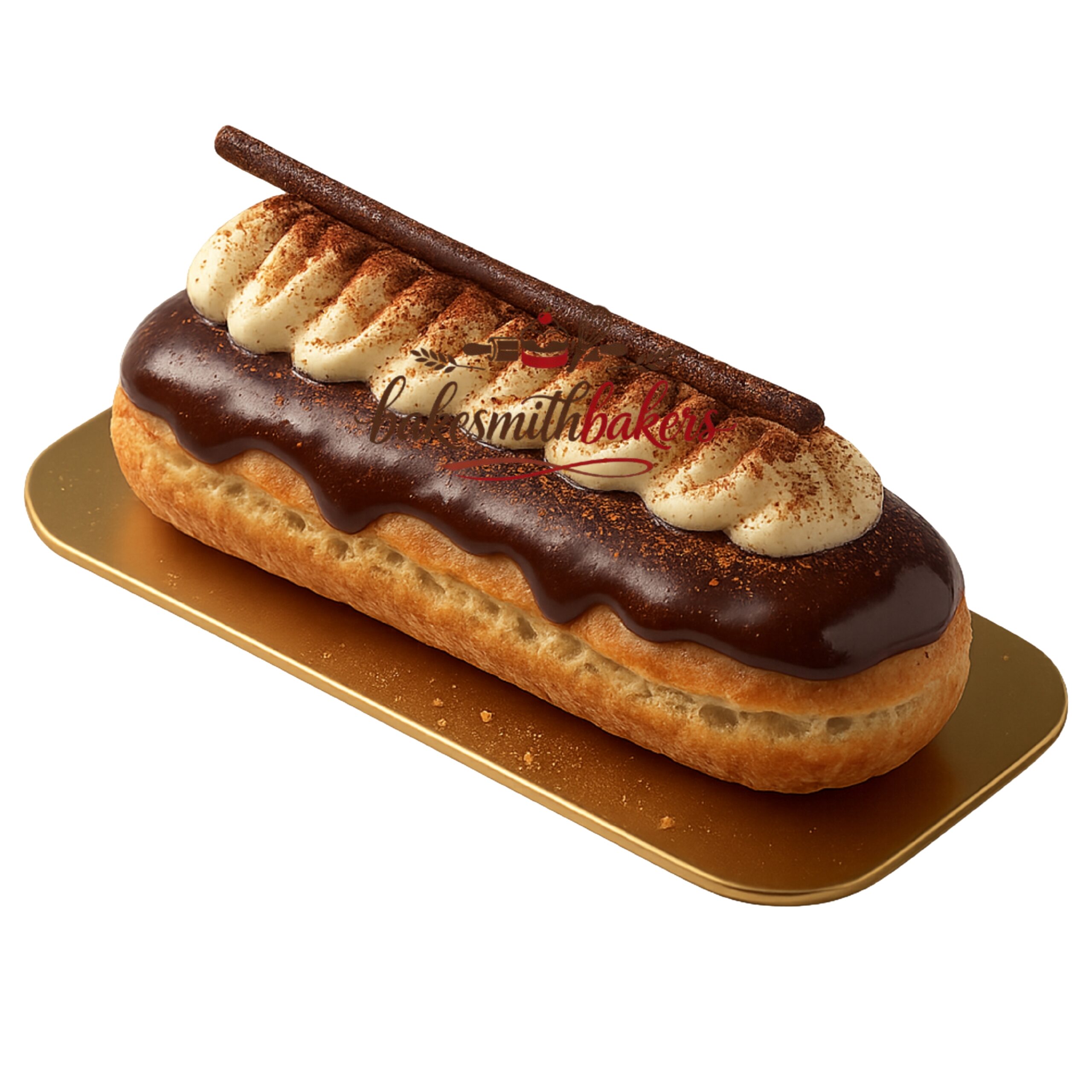 It is topped with rich chocolate icing, piped cream detailing, light powder dusting, and a chocolate stick garnish—making it visually different and premium from the classic chocolate éclair.