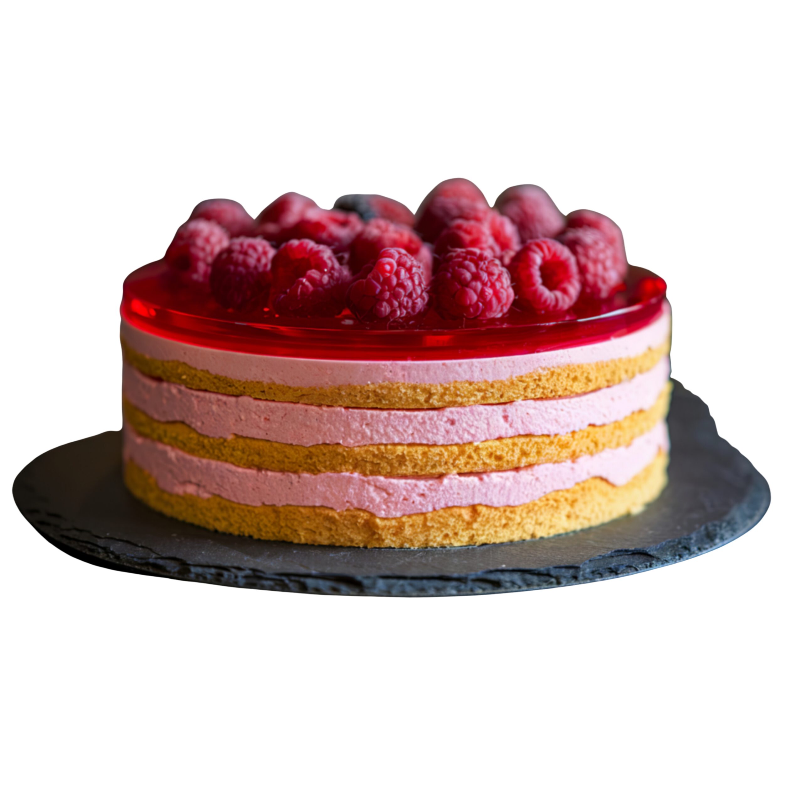 This cake is topped with fresh raspberries and a shiny raspberry jelly layer, which adds a premium visual appeal along with a burst of flavor.